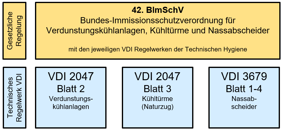 Um das von Verdunstungskühlanlagen, Kühltürmen und Nassabscheidern ausgehende Gesundheitsrisiko zu minimieren, wurde am 12. Juli 2017 die 42. Bundes-Immissionsschutzverordnung (BImSchV) über technische und organisatorische Pflichten bei der Errichtung und dem Betrieb von Verdunstungskühlanlagen, Kühltürmen und Nassabscheidern vom Bundeskabinett verabschiedet, die am 19. August 2017 in Kraft getreten ist.