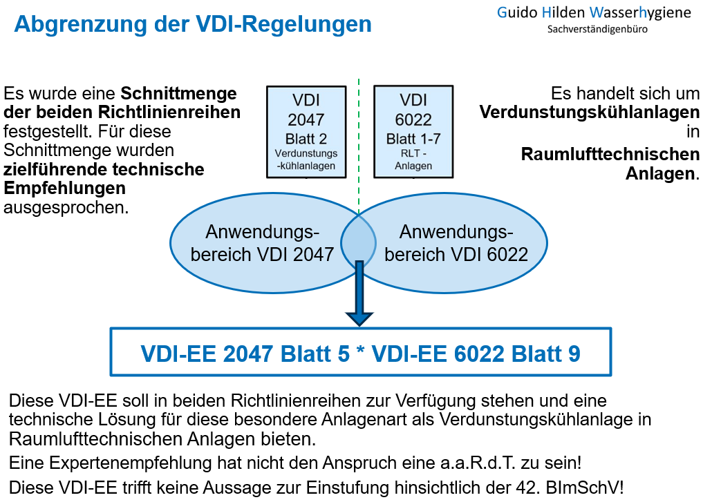 In Zusammenarbeit von Fachleuten aus den Richtlinienausschüssen VDI 2047 und VDI 6022 wurde eine VDI-Expertenempfehlung erarbeitet, die für den besonderen Anlagentyp von Verdunstungskühlanlagen in Raumlufttechnischen Anlagen die hygienetechnischen Anforderungen beschreibt. Dabei wurden die wichtigsten und bewährten Anforderungen aus beiden Regelwerksreihen zusammengetragen und eine praxistaugliche technische Lösung für diesen besonderen Anlagentyp erarbeitet.