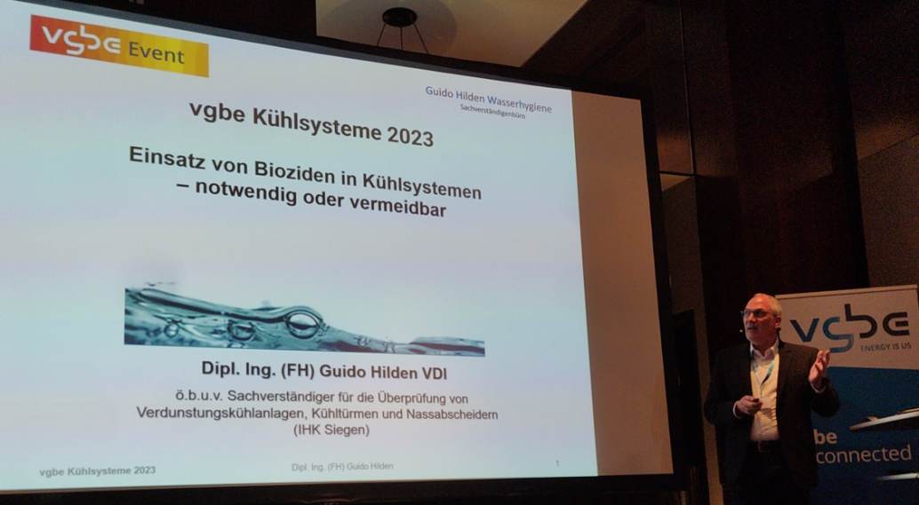 Bei der vgbe Veranstaltung Kühlwasser am 25. und 26.04.2023 in Köln konnte ich mit einen kurzen Vortrag zur Hygiene in Verdunstungskühlanlagen auf den bedarfsgerechten Einsatz von Bioziden hinweisen: