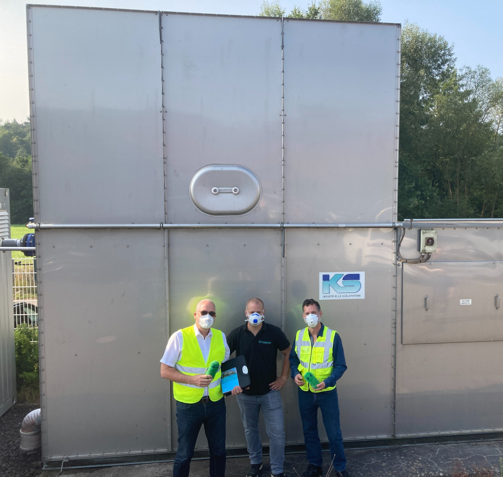 Die beiden ö.b.u.v. Sachverständige Guido Hilden und Dirk Tutas haben sich am Tag der Kühlwasserhygiene zur fristgerechten Überprüfung von Verdunstungskühlanlagen beim Betreiber WALTHER-WERKE Ferdinand Walther GmbH in Eisenberg. Hier auf dem Bild (v.l.n.r Guido Hilden, der Betreiber Christian Brätsch und Dirk Tutas) mit FFP 2 Schutzmaske und Legionellen Stofftiere. Der Betreiber konnte noch einen fristgerechten Termin zur 2. Überprüfung realisieren, weil er sich frühzeitig um den Termin gekümmert hat und sich grundsätzlich dem hygienegerechten Betrieb der Anlage stellt. Im Zuge der Sachverständigenüberprüfung werden über 100 Einzelanforderungen abgefragt und dabei sowohl Ausführungsanforderungen der Anlage, als vor allem auch Betriebsanforderungen (inkl. umfangreicher betreiberseitiger Dokumentationsaufgaben) auf deren Umsetzung überprüft. Bei dieser Prüfung konnte Herr Tutas sich wieder vom hygienegerechten Betrieb der Anlage überzeugen.